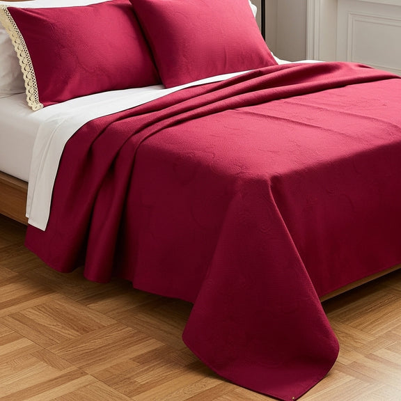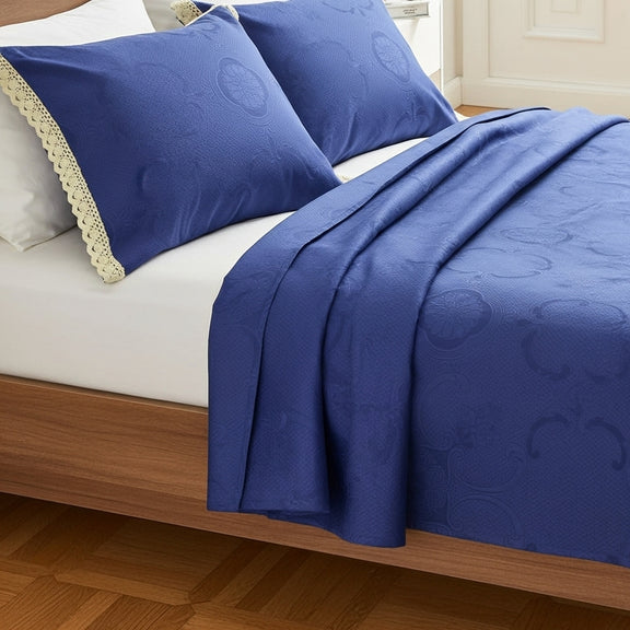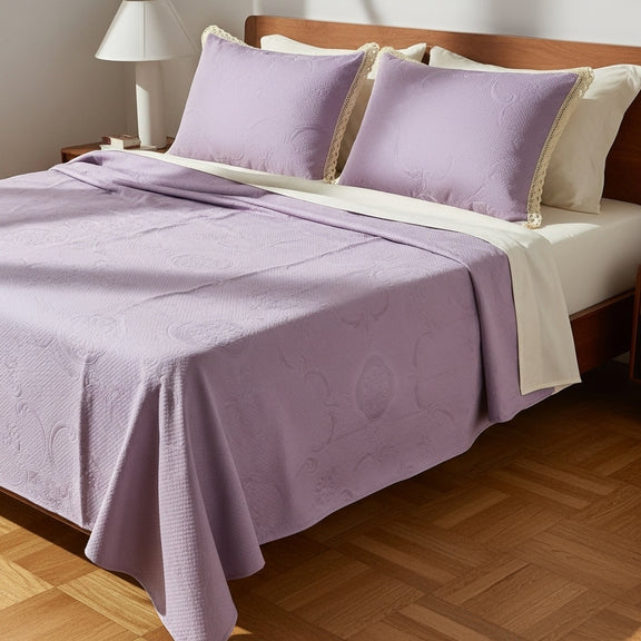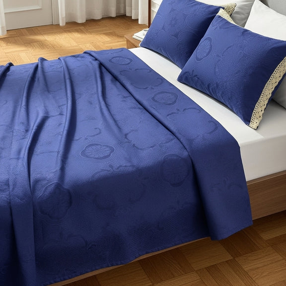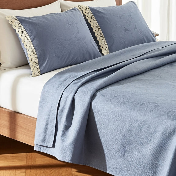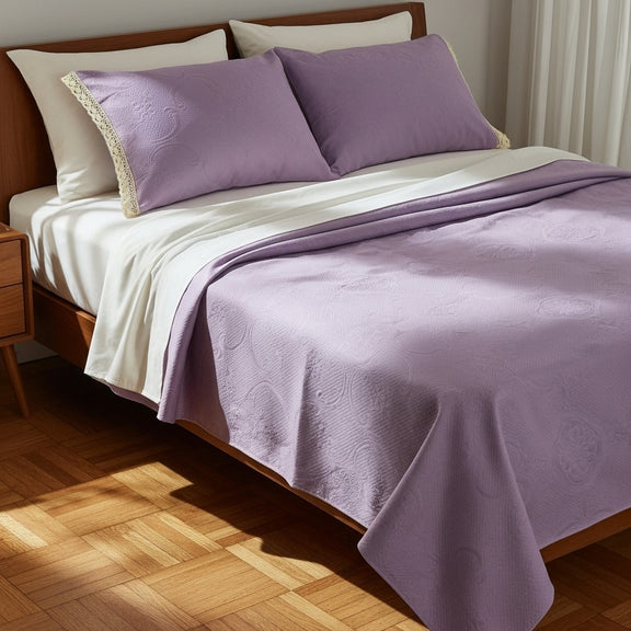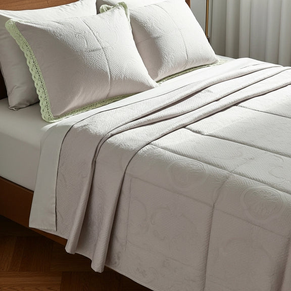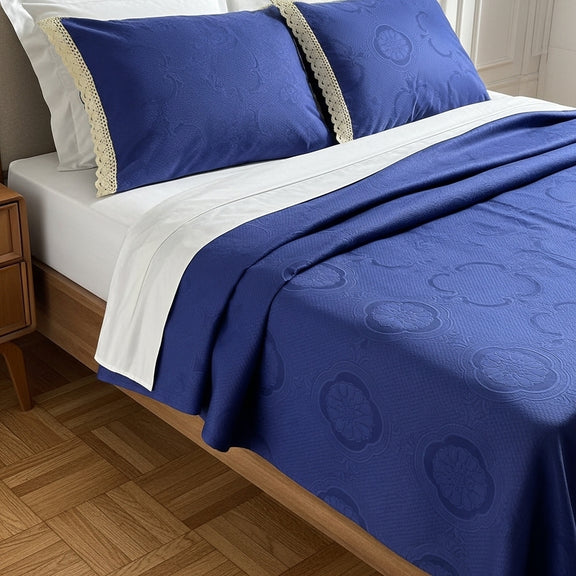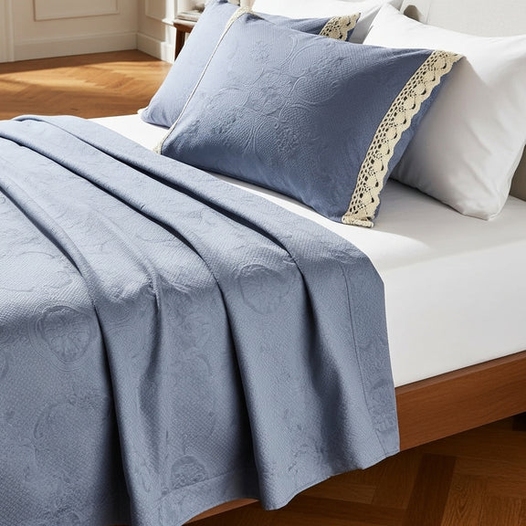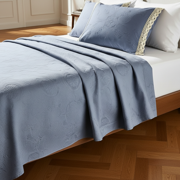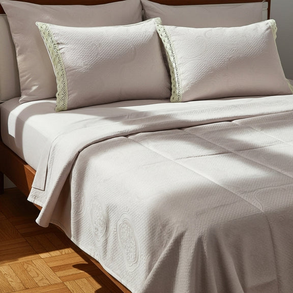 الكوفرتة بنسيج متين ولمسة ناعمة، متفرشة بشكل طبيعي يبرز جمال القماش وجودته، ومعها خداديّات بإطار كروشيه يدوي أنيق يضيف شخصية خاصة للطقم ويعكس روح الحرفة.