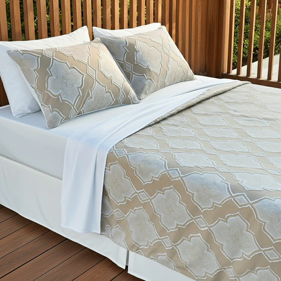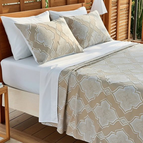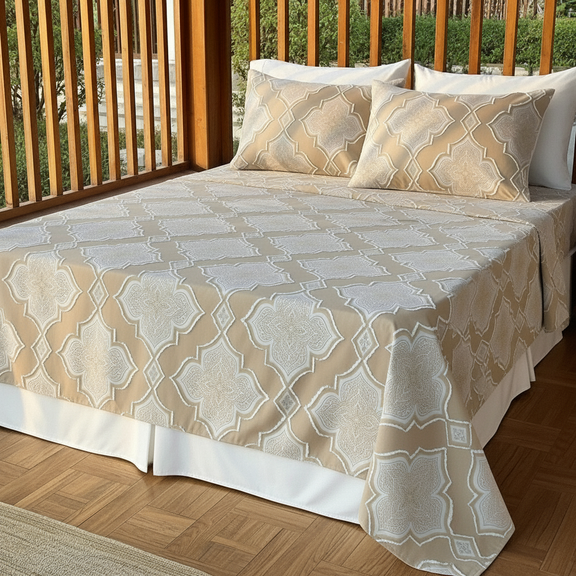 طقم ملاءة فاخر بتصميم أرابيسك راقٍ مستوحى من جمال النقوش الشرقية الكلاسيكية، يجمع بين الفخامة والهدوء في قطعة واحدة تليق بغرف النوم الراقية.